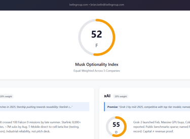 A consolidated grade for Musk’s ecosystem (Tesla, SpaceX/Starlink, xAI, X), scoring milestones, regulatory risk, and revenue proof to show real vs. hype. Click the image to go to the full tool.