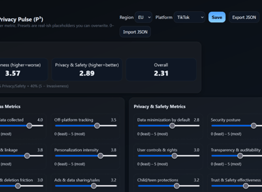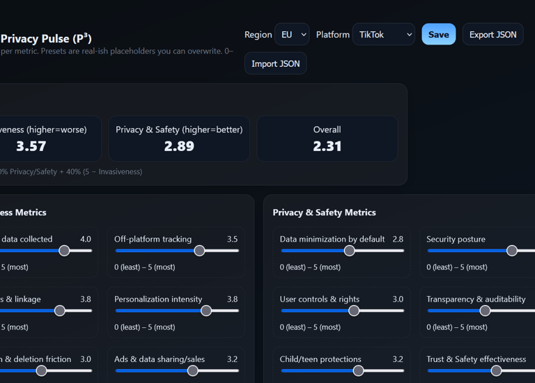 Interactive sliders and metrics to rate a platform’s data hunger, transparency, user rights, and security posture—exportable for audits and comparisons. Click the image to go to the full tool.