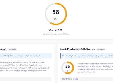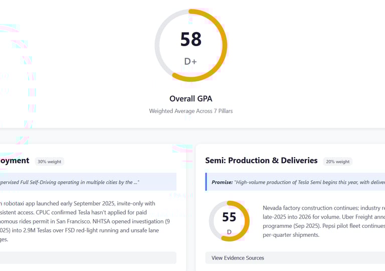 Tracks Tesla’s public promises vs. delivery across FSD/robotaxi, Semi, energy and manufacturing, with weighted grades, timelines, and sourced notes. Click the image to go to the full tool.