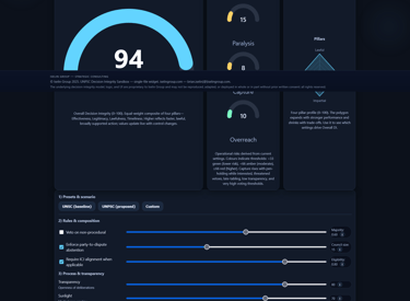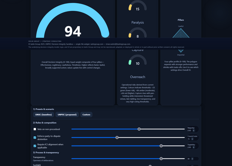 A rules-tuning simulator: adjust membership, vetoes, and procedures to compare today’s UNSC with reform options and see decision-integrity impacts. Click the image to go to the full tool.