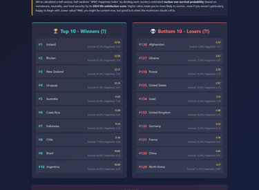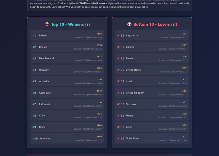 A thought-experiment index ranking countries by survivability factors (remoteness, neutrality, food/energy resilience, civil defence)—designed to provoke policy debate, not panic. Click the image to go to the full tool.