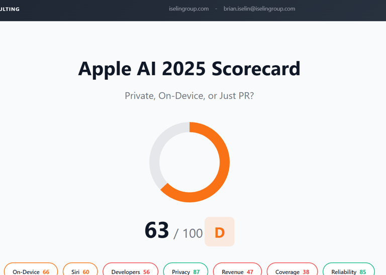 Grades Apple’s AI strategy across on-device capability, Siri progress, developer ecosystem, privacy posture, reliability, market coverage, and revenue traction—separating “private, on-device” reality from PR with transparent, weighted metrics.